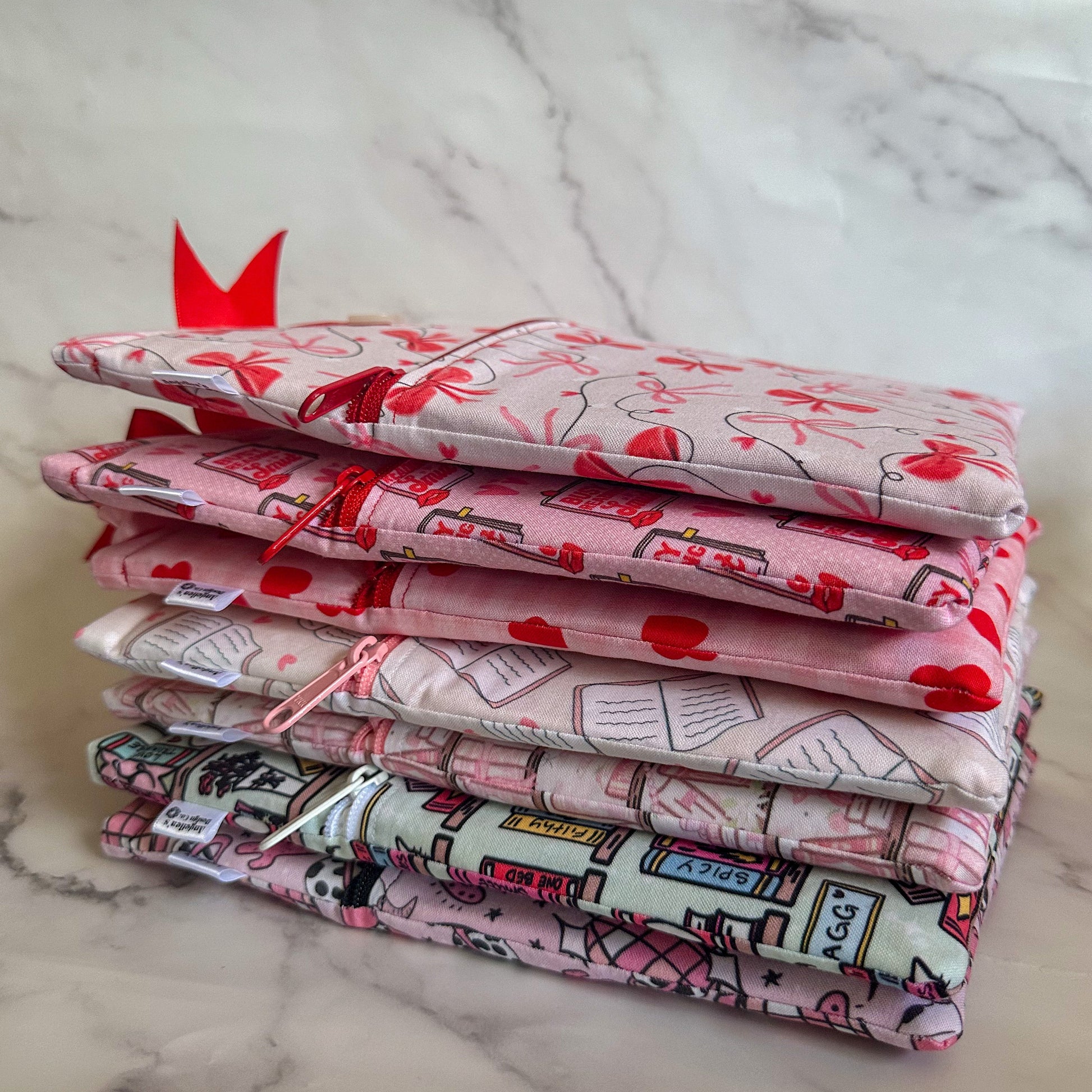 So, I created the perfect padded book sleeves for readers who need to carry all their bookish essentials without any mishaps! Featuring a zippered pocket for accessories, and a button with elastic loop to keep everything secure, our sleeves come in three sizes and a variety of cute prints. A must-have for any bookish girlie!